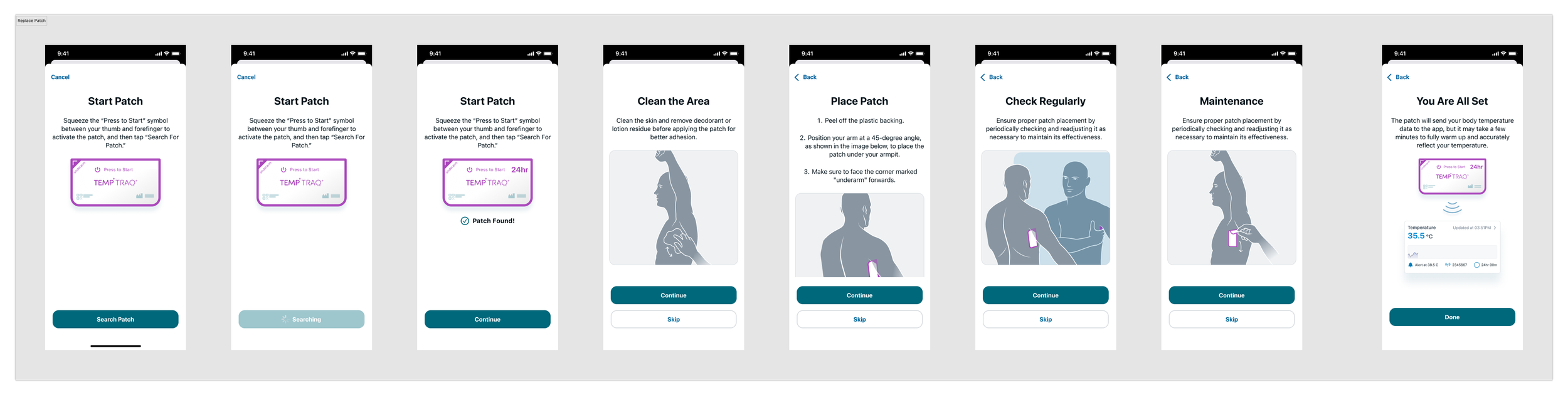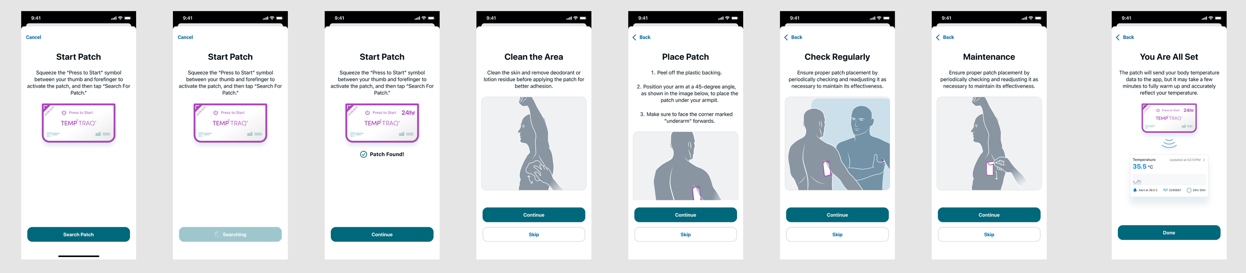 The following are the high-fidelity mockup wireframes for the remote new patient onboarding flow. This was a step-by-step manual that led the user to instructions on how to apply the temperature monitoring patch. We found that this persona did best with completing the task when the flow was broken down into small sections, including photos and validations.