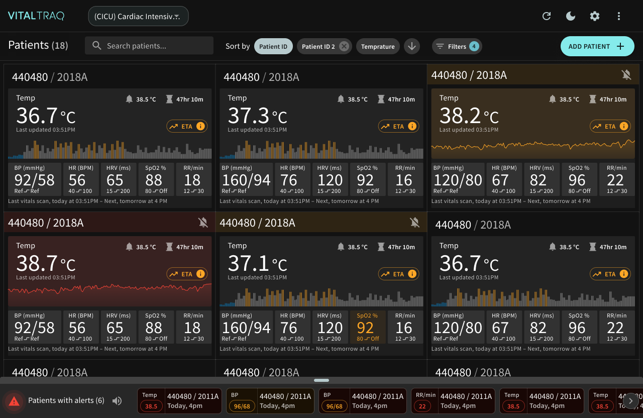 Our finalized designs consisted of a dark mode web app for clinicians and pharma providers that provided sorting and filter capabilities as well as patient temperature alerts. We found out that the ability to scan data quickly was the biggest request, as well as seeing a patient’s vital trends.